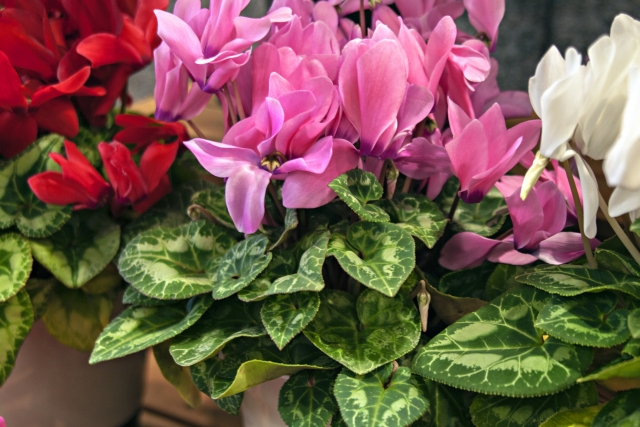 シクラメンは冬に彩りを添える多年草で、鉢植え用に改良された品種は美しい花を長く咲かせられる反面、寒さにはやや弱い傾向があります。