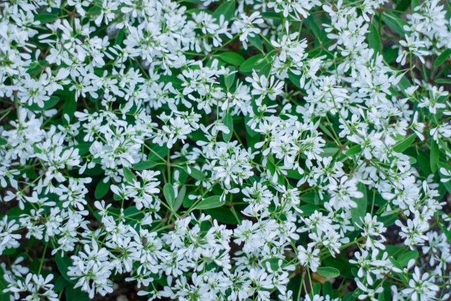 低木タイプや草花タイプでは、開花前に緩効性肥料を株元に施すと花つきがよくなります。